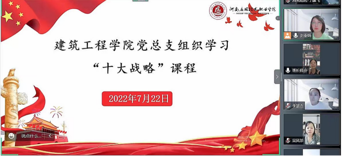 2022年07月22日下午,永利集团88304官网集团党总支组织全体教师学习“十大战略”系列课程之《实施优势再造战略 重塑河南高质量发展新优势》,本次学习通过腾讯会议形式进行线上学习,旨在贯彻落实省委“能力作风建设年”活动要求,引导全体教师关注省委部署的关键性、战略性、全局性工作,为现代化河南建设贡献教育力量,会议由学院党总支书记马春燕主持。