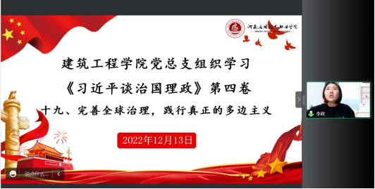 2022年12月13日下午,永利集团88304官网集团党总支通过腾讯会议组织开展线上政治理论学习活动,集中学习了《求是》2022年第23期习近平总书记重要文章《在党的十九届七中全会第二次全体会议上的讲话》《习近平谈治国理政》第四卷、《全面从严治党向基层延伸》《习近平生态文文明思想学习纲要》《习近平经济思想学习纲要》等部分内容。会议由永利集团88304官网集团党总支书记马春燕主持,院长张虎及全体教职工参加会议。