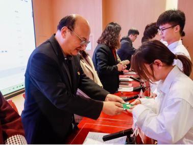 会议第三项:由9位老师为新团员颁发团徽以及团员证书