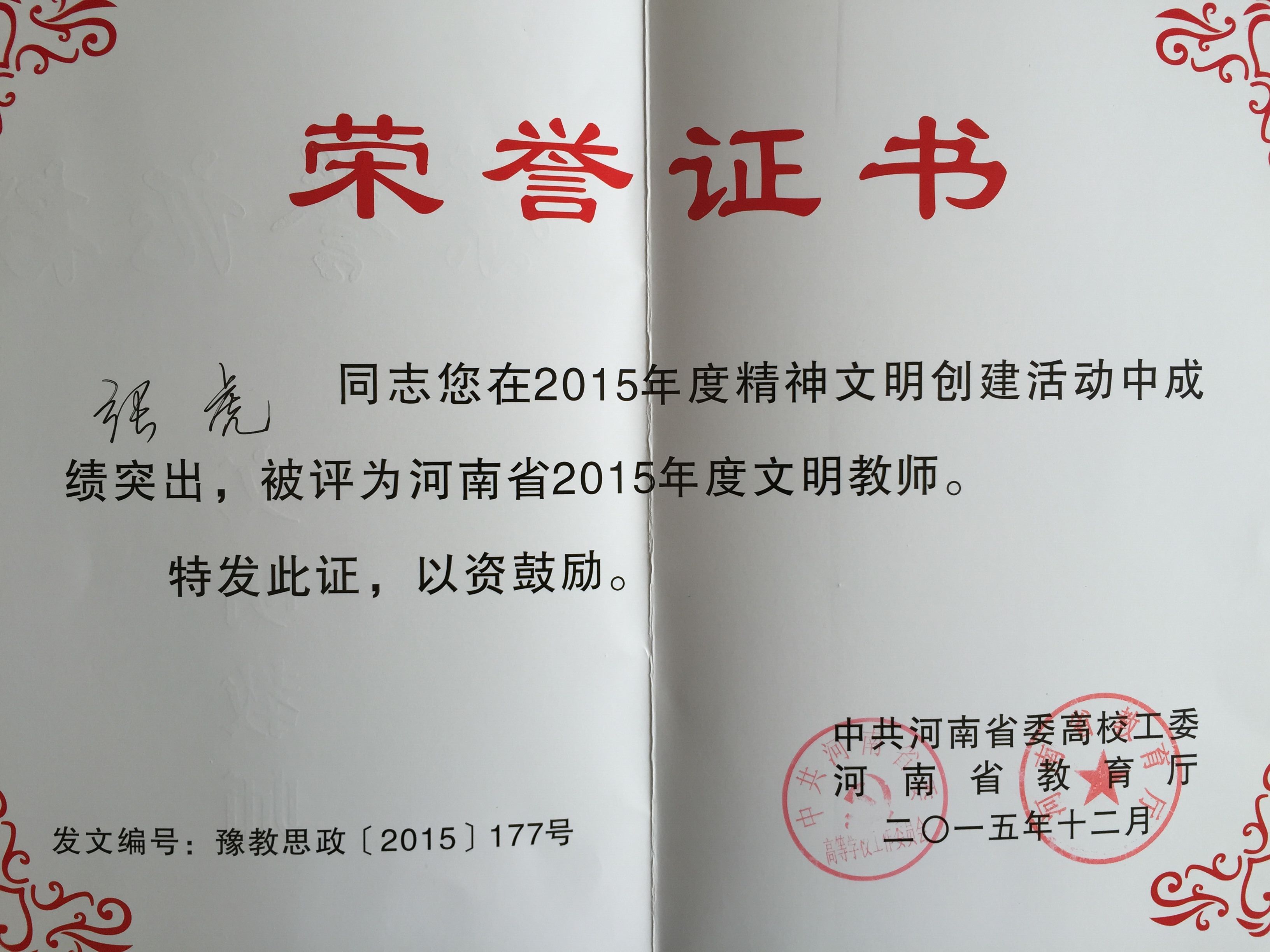 在热烈祝贺张虎同志荣获文明教师称号的同时,我系也大力宣传了弘扬文明精神,弘扬奉献精神,号召全系教职工提高教学水平,敢于创新,为系部的发展再上新台阶贡献力量。