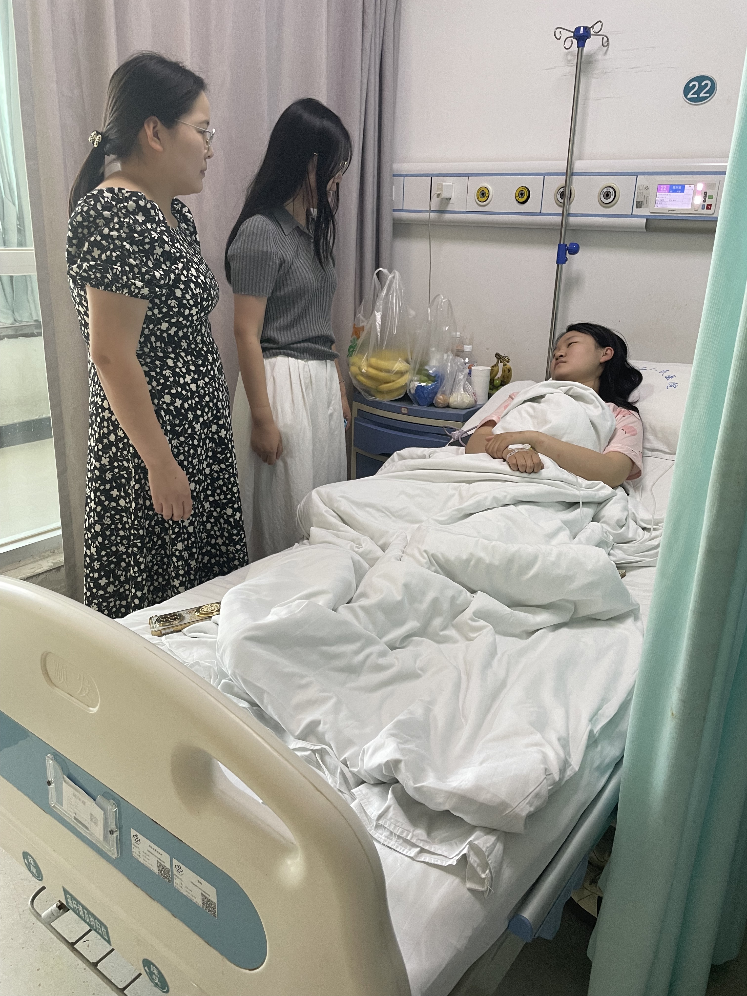 针对郑州灿起科技实业有限公司实习学生陈年慈遭遇交通事故受伤的情况,李玉飞老师第一时间与辅导员张寒冰一同前往探望,详细了解学生伤情与康复进展,协助企业与学生处理保险理赔事宜,为学生提供暖心关怀与实际帮助,让学生在异乡感受到学院的温暖支持。