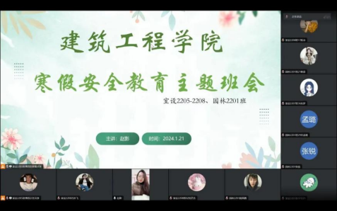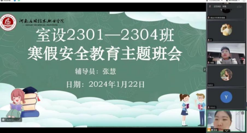 为提高学生安全意识和自我防护能力,做到“快乐过寒假,安全不放假”,永利集团88304官网集团组织全体专兼职辅导员于1月22日至1月23日召开线上寒假安全主题班会。