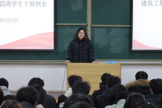 会上,史真着重强调,宿舍安全管理是学生干部的责任,关乎同学生命财产与身心健康,需营造安全舒适的宿舍环境。此外,她鼓励同学们参与四月的春季运动会并做好后勤工作,助力运动会开展。李希望介绍了春季运动会的竞赛项目、训练时间安排,提及以往同学取得的优异成绩,鼓励大家积极参与,挑战自我,展现建工学子的拼搏风貌。