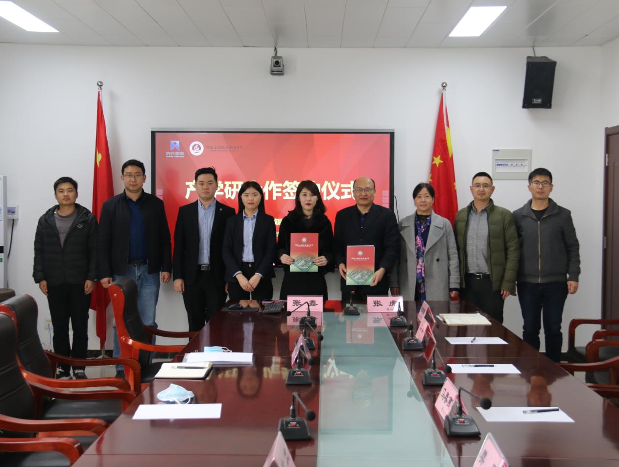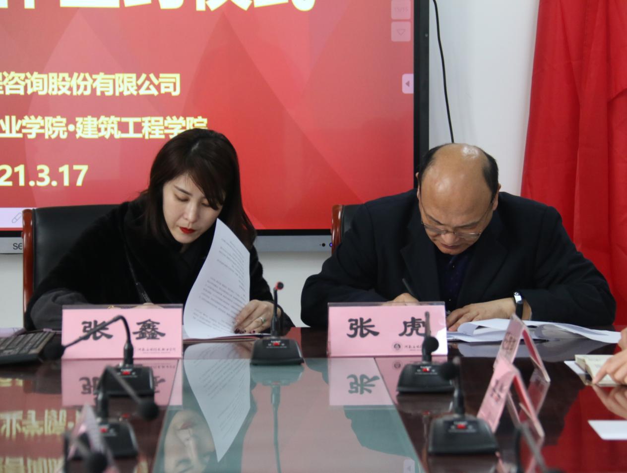 院长张虎与人资总监张鑫代表双方共同签署了产学研合作协议。与会双方代表围绕学生顶岗实习、教师挂职锻炼、订单培养产教融合协同育人等问题进行了探讨交流。