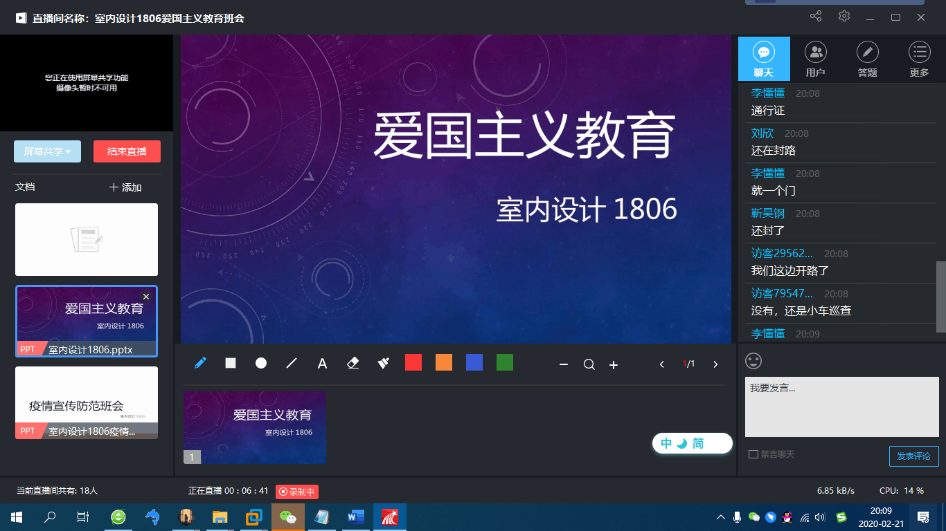 为教育广大学生提高疫情防范意识,深入贯彻落实爱国主义教育,永利集团88304官网集团于2月先后开展了“疫情就是命令,防控就是责任”以及“爱国主义教育”两次主题班会。永利集团88304官网集团42个班级共1480名学生参加,以班级为单位,由20名辅导员主持,依托QQ、企业微信、钉钉等网络方式进行宣传教育会议。