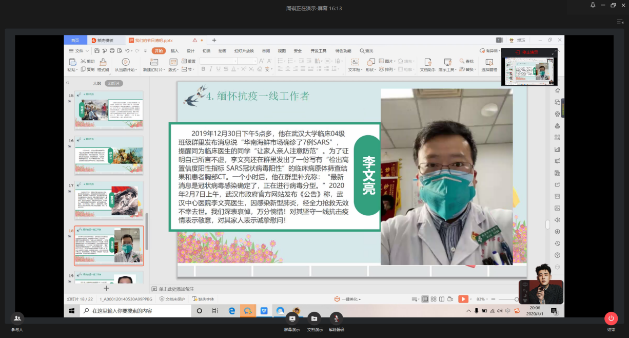 清明节是中华民族祭奠祖先、缅怀先烈、追忆逝者、悼念先人、寄托哀思的传统节日。在全国上下众志成城,坚决打赢疫情防控阻击战的关键时刻,为深入贯彻落实习近平总书记关于英烈褒扬的重要论述和指示精神,永利集团88304官网集团团总支根据《关于2020年持续开展“我们的节日”主题活动的通知》,4月1日至4日组织42个团支部1480名青年学生通过网络开展“我们的节日·清明”主题团日活动。