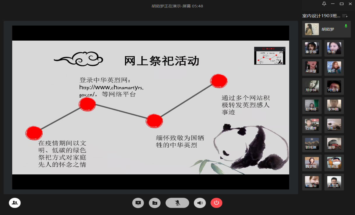 组织团员青年学习黄继光、赵一曼、邓中夏等英雄事迹,学习他们一个个顶天立地、视死如归、大义凌然,用鲜血和生命谱写了一曲曲惊天动地的壮歌,铸就了为民族独立、人民解放和新中国的建设而舍生忘死、前仆后继、气吞山河的大无畏精神。带领同学们观看《凉山木里火灾牺牲烈士女儿给父亲扫墓留言爸爸我很想您》、《黄山烈士陵园推出“云祭扫”,视频连线帮家属扫墓》等视频,充分利用团属微信公众平台,推出“文明缅怀”专题,通过鲜花追思、丝带祭祀、缅怀寄语等方式,引导青年学生运用线上平台寄托哀思,组织广大青年学生,缅怀烈士、追思先人,表达对先烈的感恩和敬仰。
