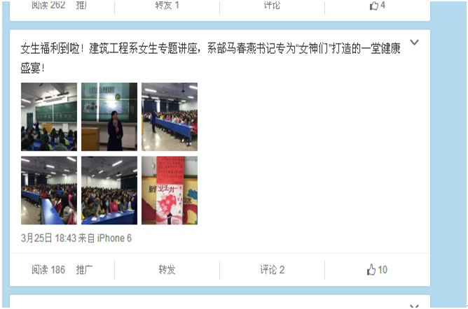 三月文明礼貌月,建筑工程系特举办了具有本系特色的学生活动,“建筑工程系女生专题讲座”。此次讲座为了增强本系女生安全防范意识,提高女生日常卫生生活,打造安全、绿色、幸福的校园生活。本次活动由建筑工程系马春燕书记主讲,并得到了全系上下女生的高度赞誉。讲座后,女学生们普遍反映从讲座中得到了很多常识和知识,是一次具有人生中重大意义的提高。
