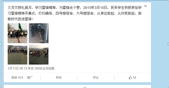 建筑工程系充分利用网络平台如系部网站、微博、宣传窗、展板等各种宣传渠道,广泛、密集的向学生宣传和教育“三月文明礼貌月”精神,特别着重向本系学生宣传践行雷锋精神,争做文明先锋,争做建筑好学生,弘扬中华好美德的精神思想。通过一系列的宣传和引导,本系学生在学习中收获颇丰并在此次学习中提高了自己,美化了心灵。