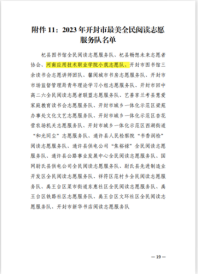 近日,由中共开封市委宣传部、中共开封市委组织部等多家单位联合发布了《中共开封市委宣传部等关于表扬开封市全民阅读活动先进典型的通知》,为激励先进、树立典型,对为推动全市全民阅读活动高质量发展的单位和个人进行了表彰。永利官网永利集团88304官网集团小筑志愿队被表彰为“2023年开封市最美全民阅读志愿服务队”。此次荣誉的获得,是对永利官网青年学子积极参加志愿服务活动的充分肯定。