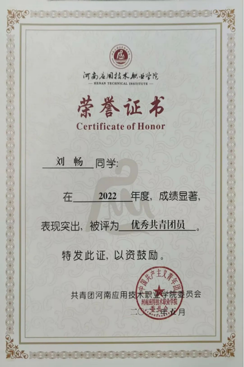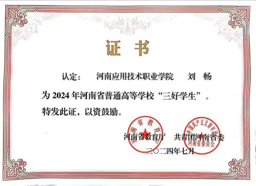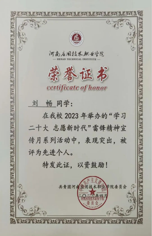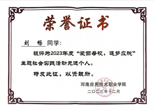 2023年12月,获得河南应用职业技术学院2022年-2023年度先进个人