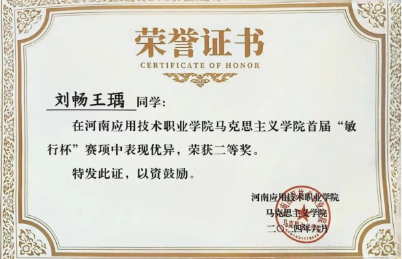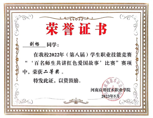 该生深知,成长创新之路虽长且艰,但每一步都踏实践行着“探索未知,勇于创新”的精神。该生利用课余时间深入实践,与团队成员紧密合作,不断挑战自该生,解决了一个又一个难题,希望创造出一个能够正在有益于社会的成果。该生的努力终结果,在创新创业的过程中,获得了全国高职院校“发明杯”大学生专利创新大赛二等奖、第十六届河南省“挑战杯”三等奖、第九届“互联网+”大学生创新创业大赛三等奖、校级“互联网+”大学生创新创业大赛二等奖等。创新路上竞技增进自该生,休息期间该生乐于参加学校组织的各项比赛活动,锻炼表达能力和随机应变的能力,在此期间荣获永利集团88304官网集团“春季运动会”拔河一等奖、永利集团88304官网集团第一届“敏行杯”二等奖、永利集团88304官网集团“爱回母校,逐梦应院”二等奖、永利集团88304官网集团“百名师生共讲红色爱国故事”二等奖等。