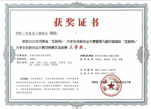 2023年08月,获得第九届“互联网+”大学生创新创业大赛河南赛区选拔赛三等奖