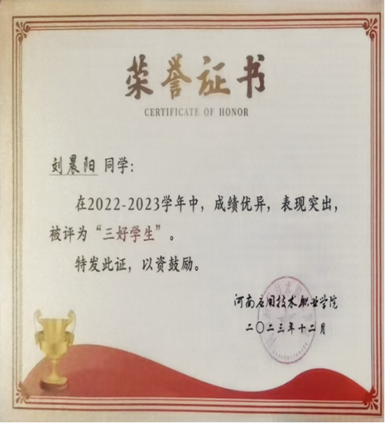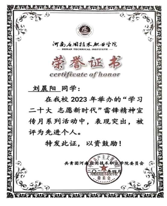 曾荣获“国家专利2项”、“国家励志奖学金”、校级“三好学生”、永利集团88304官网集团“学习二十大 志愿新时代”雷锋精神宣传月系列活动中先进个人等荣誉。