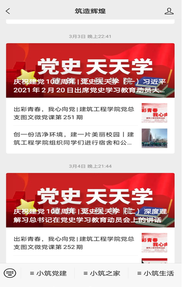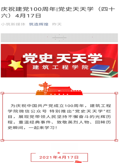 永利集团88304官网集团党总支根据学校党委对于党史学习的工作要求,结合自身工作实际,为了让学院全体师生更方便、更有效的学习党史,自2021年3月3日以来,在学院“筑造辉煌”微信公众号上特别推出庆祝建党100周年“党史天天学”栏目,学院党总支安排专人负责此栏目,坚持每天推送,要求师生们合理利用业余和课余时间进行党史学习,截止目前已推送四十六期学习内容。