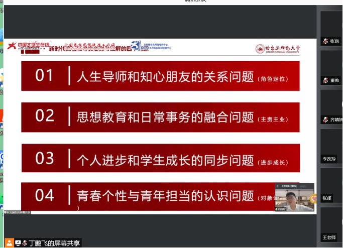 本次讲座由2021年“最美高校辅导员”、哈尔滨师范大学马克思主义学院辅导员刘国权老师主讲,刘国权从人生导师和知心朋友的关系问题、思想教育和日常事务的融合问题、个人进步和学生成长的同步问题、青春个性与青年担当的认识问题4个方面进行讲解。他认为,辅导员首先要提升自我能力,将个人进步与学生成长同步,摒弃传统工作思维,了解当代大学生所关注的热点,跟上时代的步伐,用心帮助学生解决实际问题等方式赢得学生的敬佩,同时,将思想政治教育与日常工作相融合,从日常工作中解脱出来讲好思政大课,把学生当成自己的知心朋友,做好学生的人生导师这一角色,实现新时代高校辅导员的“六个统一”。