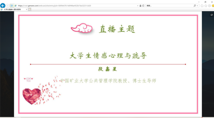 高钰:通过观看直播,让我明白了在日益激烈的社会大环境下,大学生面临的心理压力越来越大,学业问题、情感问题、就业问题等是困扰大学生心理健康的重要因素,所以,大学生心理健康教育工作任重道远,而作为大学生人生导师和良师益友的辅导员们,更是肩负着重大的责任。我们应该积极引导大学生树立正确的人生观、价值观、恋爱观。