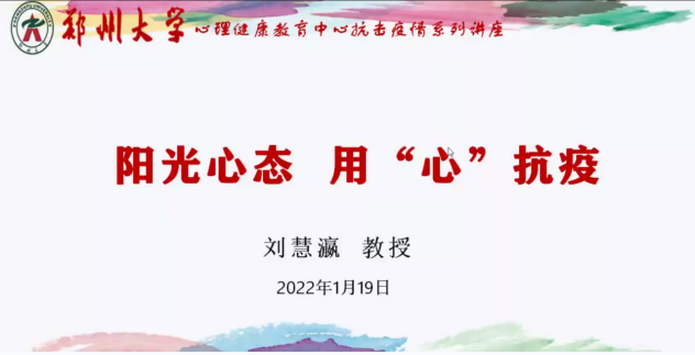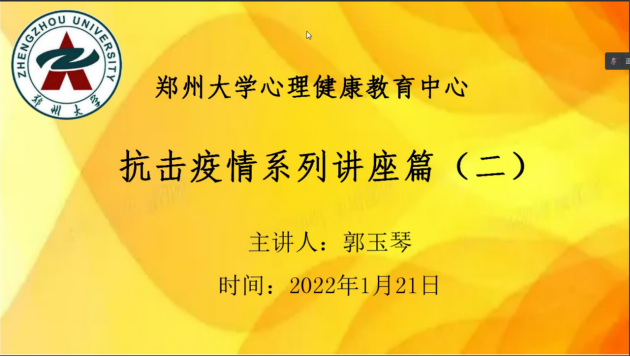 为切实做好疫情期间大学生的心理健康教育工作,进一步缓解学生心理压力,减轻心理负担,确保学生疫情期间的思想健康稳定。2022年1月19日、21日,永利集团88304官网集团组织2019级、2020级、2021级三个年级辅导员、班主任参加郑州大学心理健康教育中心举办的抗击疫情系列讲座,讲座由郑州大学心理健康教育中心副主任刘慧瀛和郑州大学心理健康教育中心督导郭玉琴讲解。