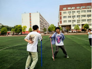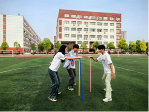 活动开始前,各队成员手持一根塑料杆,立在地上,围成一个圆圈,左手背后,右手掌心抵住塑料杆顶部,跃跃欲试,整装待发。在裁判的一声“开始”令下,同学们眼神坚定,精神集中,伴着队员的口号指令,有节奏地向前迅速移动,完成上一个队友的塑料杆交接。