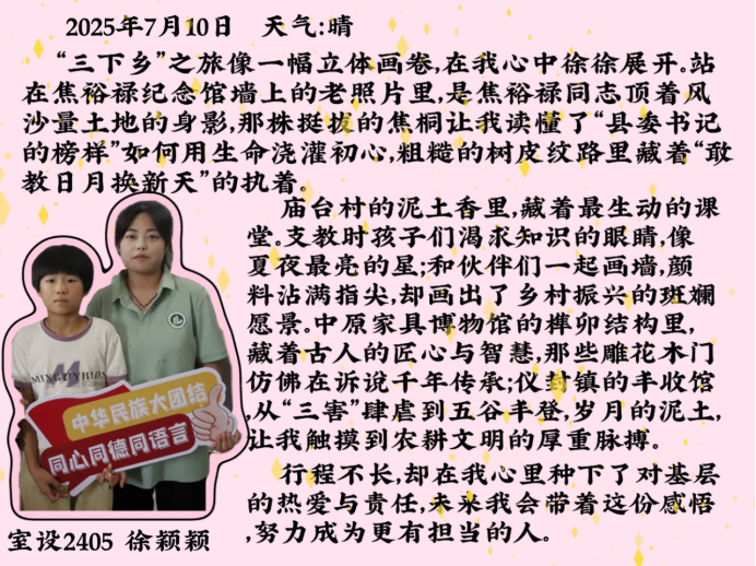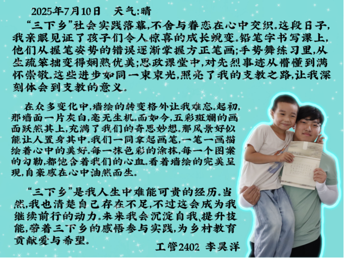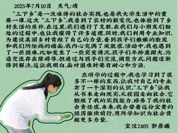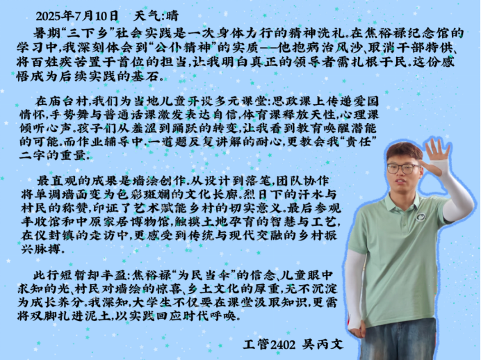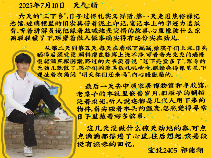 永利集团88304官网集团“小筑”志愿服务队暑期“三下乡”社会实践的余热尚未褪去,队员们带回的不仅是兰考大地的风尘,更有浸润在乡土里的思考与成长。从支教课堂上的童真互动,到墙绘现场的协作攻坚,从博物馆里的古今对话,到与村民攀谈时的质朴共鸣,不同的实践场景里,藏着同样滚烫的收获。让我们继续倾听他们在乡土间播撒青春、收获感悟的故事。
