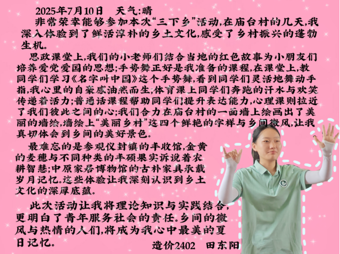 这些来自实践一线的心声,是青春与乡土碰撞出的火花,是理论与实践交融后的顿悟。无论是对专业价值的再认识,还是对责任担当的深体会,都让“三下乡”的意义超越了旅程本身。当这份经历化作前行的底气,当乡土的温度融入成长的轨迹,建工学子们终将带着这份赤子之心,在“建证美好中国”的路上,把每一份感悟都变成脚踏实地的力量,让青春在服务社会的实践中绽放更持久的光芒。